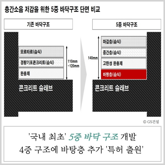GS건설에 따르면, GS용인기술연구소 친환경건축연구팀이 바닥 마감에서 바탕층과 중간층·마감층 등 3번 습식공정을 적용해 5중 바닥 구조를 실현, 층간소음을 줄이는 기술을 개발해 특허를 출원했다.