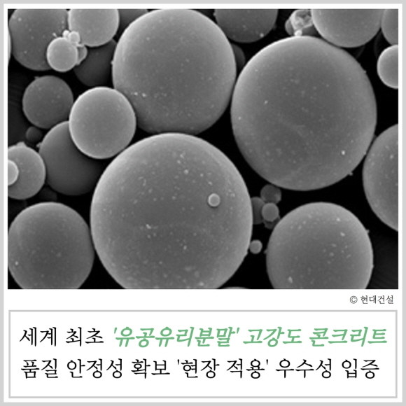 현대건설이 세계 최초 유공유리분말을 활용한 고강도 콘크리트를 개발하고 현장에 적용했다. 유공유리분말(Hollow Glass Powder)은 미세한 분말 형태로 이뤄진 구형 신재료다.