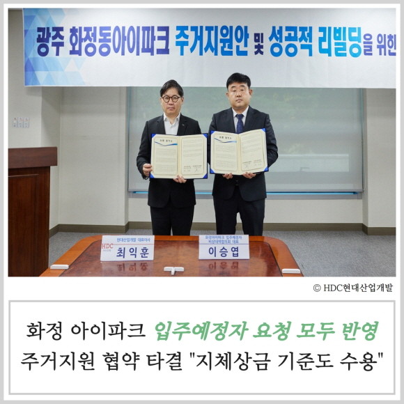 HDC현대산업개발(이하 HDC 현산)이 송갑석(광주 서구갑) · 조오섭(광주 북갑) 의원 중재로 화정 아이파크 입주예정자 협의체와 입주시까지 성공적 리빌딩을 위해 지속 협의할 것을 합의했다.