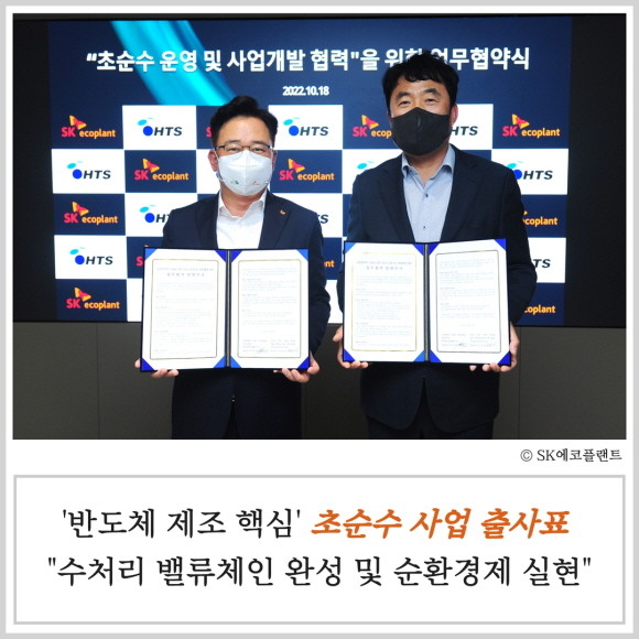 SK에코플랜트가 오는 2024년 23조원 규모로 성장이 예상되는 초순수(UPW; Ultra Pure Water) 사업에 출사표를 던졌다. 18일 한수테크니칼서비스(HTS)와의 초순수 운영 및 사업개발 협력 업무협약(MOU)을 체결한 것이다.