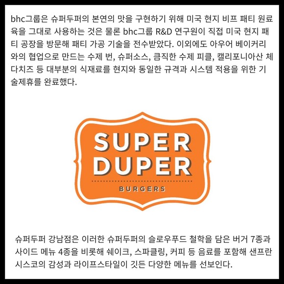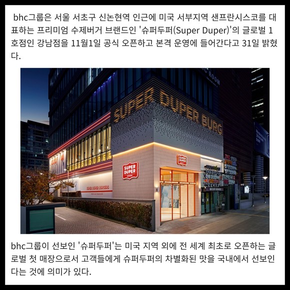 [프라임경제] bhc그룹은 서울 서초구 신논현역 인근에 미국 서부지역 샌프란시스코를 대표하는 프리미엄 수제버거 브랜드인 '슈퍼두퍼(Super Duper)'의 글로벌 1호점인 강남점을 11월1일 공식 오픈하고 본격 운영에 들어간다고 31일 밝혔다.