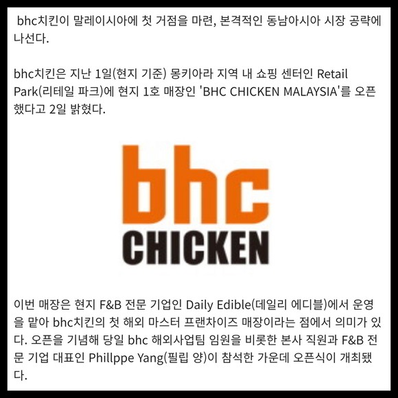 [카드] bhc치킨, 말레이시아 1호점 오픈 "동남아 공략"