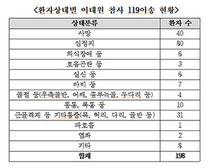 이태원 참사 당시 119가 이송한 198명의 환자 상태는 △사망 40명 △심정지 80명 △의식장애 6명 △호흡곤란 3명 △실신 6명 △마비 7명 △골절 4명 △흉통 및 복통 10명 △근골격계 기타 통증 31명 △과호흡 1명 △염좌 2명 △기타 8명이다.