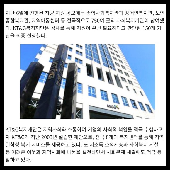 [카드] KT&G복지재단, 전국 사회복지기관에 경차 150대 지원