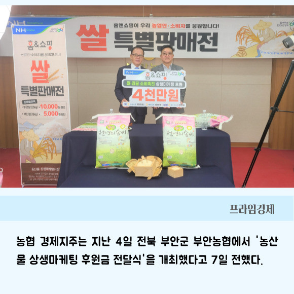 [프라임경제] 농협 경제지주는 지난 4일 전북 부안군 부안농협에서 '농산물 상생마케팅 후원금 전달식'을 개최했다고 7일 전했다.