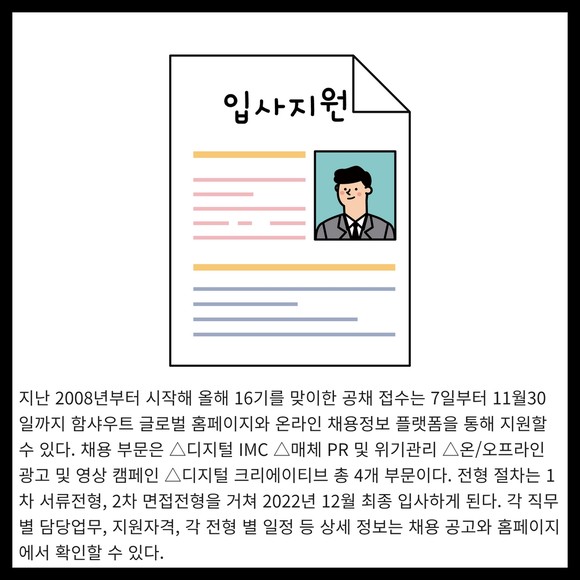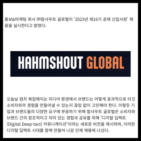 [프라임경제] 홍보&마케팅 회사 ㈜함샤우트 글로벌이 '2023년 제16기 공채 신입사원' 채용을 실시한다고 밝혔다.