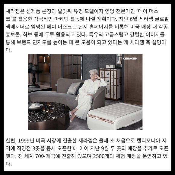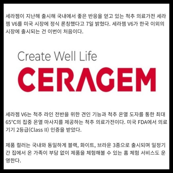 [프라임경제] 세라젬이 지난해 출시해 국내에서 좋은 반응을 얻고 있는 척추 의료가전 세라젬 V6를 미국 시장에 정식 론칭했다고 7일 밝혔다. 세라젬 V6가 한국 이외의 시장에 출시되는 건 이번이 처음이다.