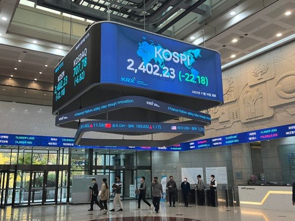 10일 서울 영등포구 여의도 한국거래소 전광판에 코스피 지수가 전장 대비 22.18p(-0.91%) 하락한 2402.23을 나타내고 있다. = 이정훈 기자