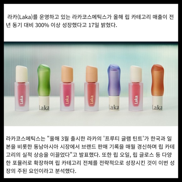 [프라임경제] 라카(Laka)를 운영하고 있는 라카코스메틱스가 올해 립 카테고리 매출이 전년 동기 대비 300% 이상 성장했다고 17일 밝혔다.