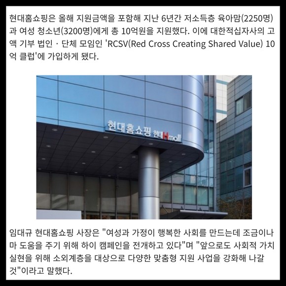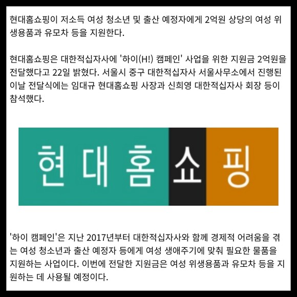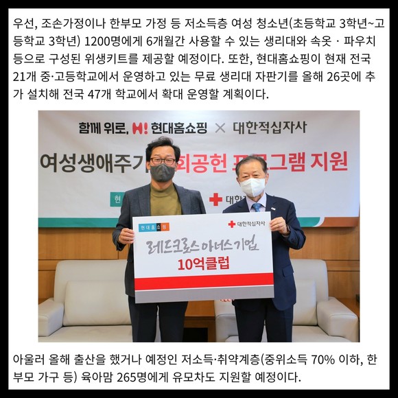 [프라임경제] 현대홈쇼핑이 저소득 여성 청소년 및 출산 예정자에게 2억원 상당의 여성 위생용품과 유모차 등을 지원한다.