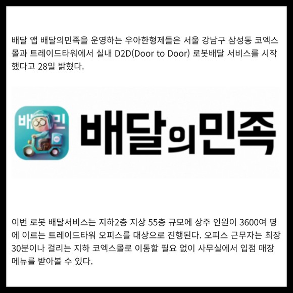 [프라임경제] 배달 앱 배달의민족을 운영하는 우아한형제들은 서울 강남구 삼성동 코엑스몰과 트레이드타워에서 실내 D2D(Door to Door) 로봇배달 서비스를 시작했다고 28일 밝혔다.