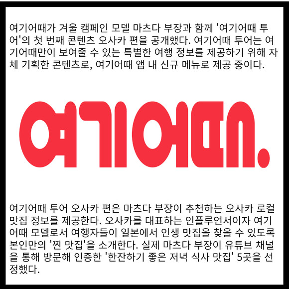 [프라임경제] 여기어때가 겨울 캠페인 모델 마츠다 부장과 함께 '여기어때 투어'의 첫 번째 콘텐츠 오사카 편을 공개했다. 여기어때 투어는 여기어때만이 보여줄 수 있는 특별한 여행 정보를 제공하기 위해 자체 기획한 콘텐츠로, 여기어때 앱 내 신규 메뉴로 제공 중이다.