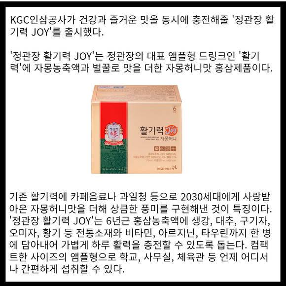 '정관장 활기력 JOY'는 정관장의 대표 앰플형 드링크인 '활기력'에 자몽농축액과 벌꿀로 맛을 더한 자몽허니맛 홍삼제품이다.