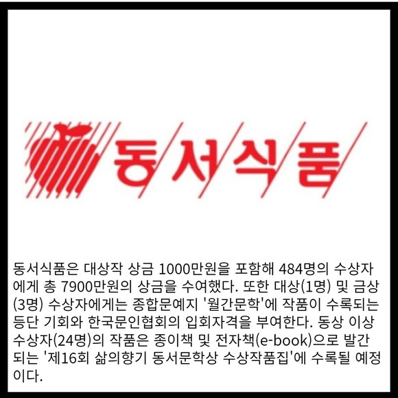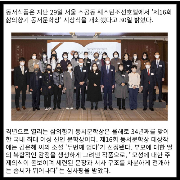 [프라임경제] 동서식품은 지난 29일 서울 소공동 웨스틴조선호텔에서 '제16회 삶의향기 동서문학상' 시상식을 개최했다고 30일 밝혔다.
