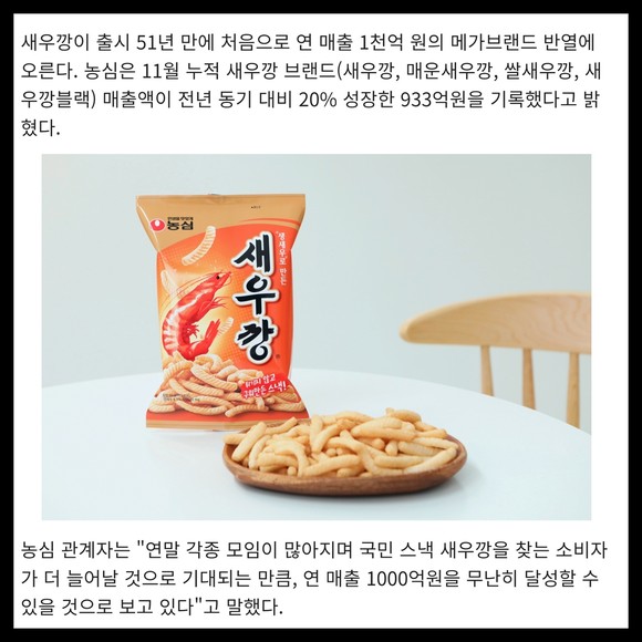 [프라임경제] 새우깡이 출시 51년 만에 처음으로 연 매출 1천억 원의 메가브랜드 반열에 오른다. 농심은 11월 누적 새우깡 브랜드(새우깡, 매운새우깡, 쌀새우깡, 새우깡블랙) 매출액이 전년 동기 대비 20% 성장한 933억원을 기록했다고 밝혔다.