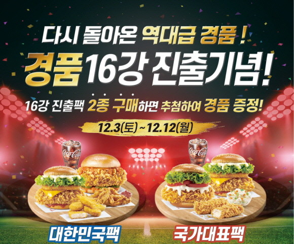 해당 행사는 오는 12일까지 진행되며, 고객 사랑에 대한 보답과 고생한 대한민국 축구팀을 위해 준비한 팩 메뉴를 구매한 고객에 한해 다양한 상품이 제공된다