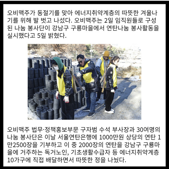 [프라임경제] 오비맥주가 동절기를 맞아 에너지취약계층의 따뜻한 겨울나기를 위해 발 벗고 나섰다. 오비맥주는 2일 임직원들로 구성된 나눔 봉사단이 강남구 구룡마을에서 연탄나눔 봉사활동을 실시했다고 5일 밝혔다.