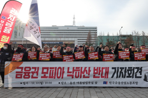전국금융산업노조는 12일 오전 서울 용산구 대통령 집무실 앞에서 '금융권 모피아 낙하산 반대 기자회견'을 열었다.