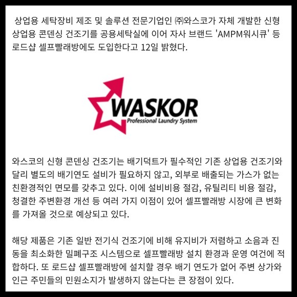 [카드] 와스코, 셀프빨래방에 콘덴싱건조기 도입
