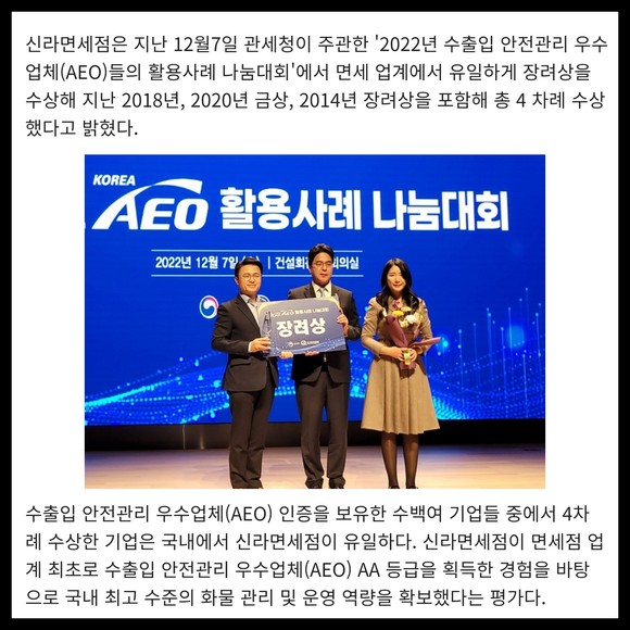 [프라임경제] 신라면세점은 지난 12월7일 관세청이 주관한 '2022년 수출입 안전관리 우수업체(AEO)들의 활용사례 나눔대회'에서 면세 업계에서 유일하게 장려상을 수상해 지난 2018년, 2020년 금상, 2014년 장려상을 포함해 총 4차례 수상했다고 밝혔다.