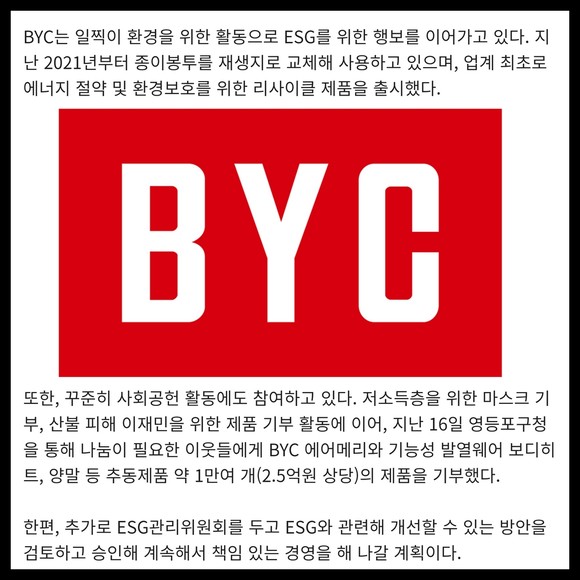 [프라임경제] BYC는 지속가능한 미래를 만들기 위해 ESG 경영 확대에 나선다.