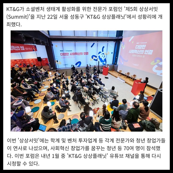 [프라임경제] KT&G가 소셜벤처 생태계 활성화를 위한 전문가 포럼인 '제5회 상상서밋(Summit)'을 22일 서울 성동구 'KT&G 상상플래닛'에서 성황리에 개최했다.