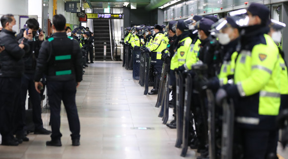 시위가 열린 서울 지하철 5호선 광화문역에 경찰 병력이 배치돼 있는 모습. ⓒ 연합뉴스