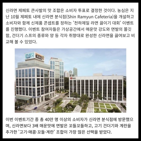 [프라임경제] 농심이 메타버스 플랫폼 '제페토'에서 소비자들에게 가장 큰 호응을 얻은 조합을 적용한 '신라면 제페토 큰사발'을 한정판으로 출시한다. 신라면 제페토 큰사발은 스코빌지수가 6000SHU으로 기존 신라면 큰사발의 3배에 달한다. 또한, 고기와 계란 건더기를 풍성하게 넣어 건더기 스프의 중량이 약 2배(2.5g → 4.9g)에 이른다. 전자레인지 조리가 가능해 더욱 쫄깃하게 즐길 수 있다.