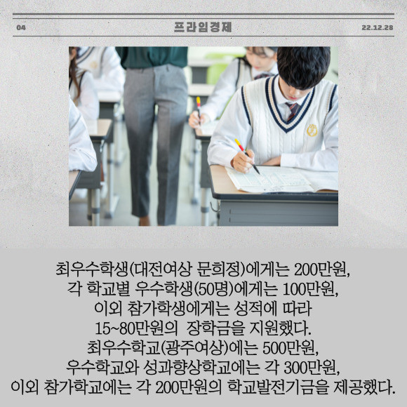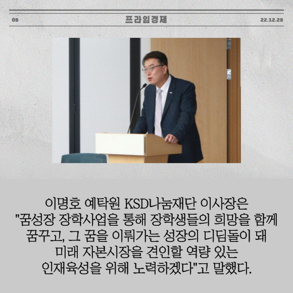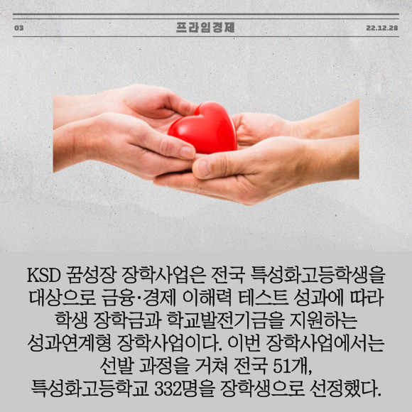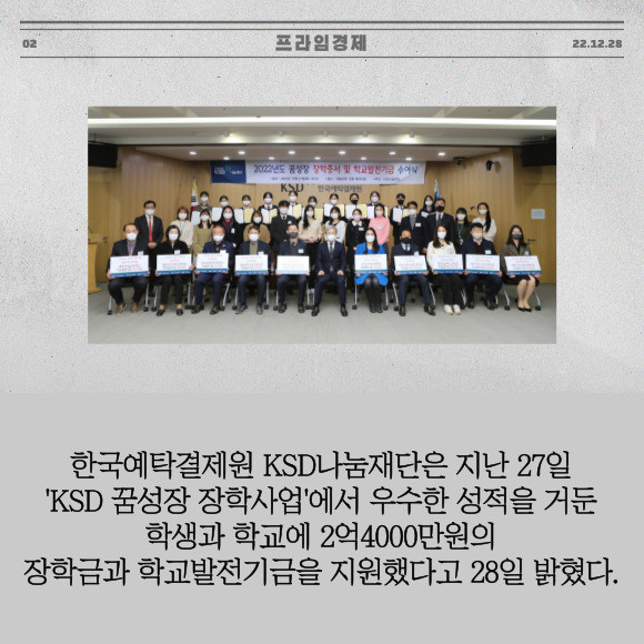 [프라임경제] 한국예탁결제원 KSD나눔재단은 지난 27일 'KSD 꿈성장 장학사업'에서 우수한 성적을 거둔 학생과 학교에 2억4000만원의 장학금과 학교발전기금을 지원했다고 28일 밝혔다.