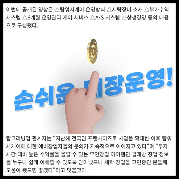 [카드] 탑크리닝업, 무인창업 아이템 셀프빨래방 '탑워시케어' 홍보영상 공개