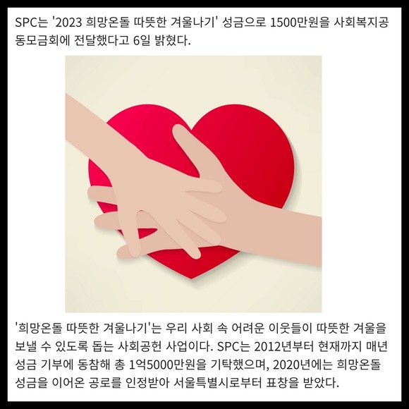 [프라임경제] SPC는 '2023 희망온돌 따뜻한 겨울나기' 성금으로 1500만원을 사회복지공동모금회에 전달했다고 6일 밝혔다.