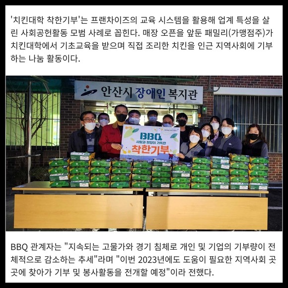 [프라임경제] 제너시스BBQ가 대표 사회공헌활동 '치킨대학 착한기부'의 새해 첫 기부 활동을 시작했다. BBQ는 2000년부터 24년째 착한기부를 통해 지역사회에 나눔을 펼치며 상생 경영을 실천해오고 있다.