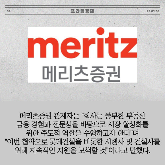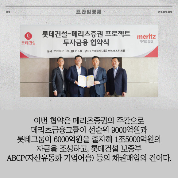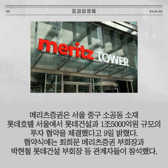 [프라임경제] 메리츠증권(008560)은 서울 중구 소공동 소재 롯데호텔 서울에서 롯데건설과 1조5000억원 규모의 투자 협약을 체결했다고 9일 밝혔다. 협약식에는 최희문 메리츠증권 부회장과 박현철 롯데건설 부회장 등 관계자들이 참석했다.