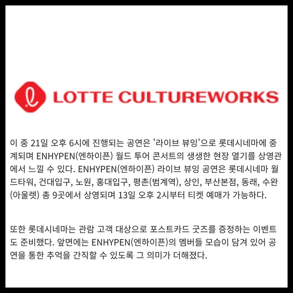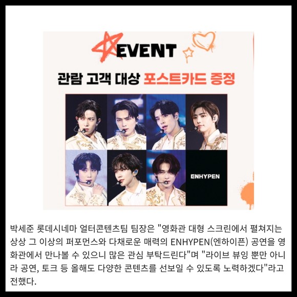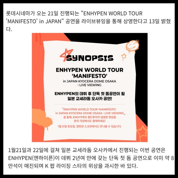 [프라임경제] 롯데시네마가 오는 21일 진행되는 "ENHYPEN WORLD TOUR 'MANIFESTO' in JAPAN" 공연을 라이브뷰잉을 통해 상영한다고 13일 밝혔다.