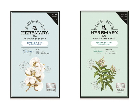허브마리1848 드라이시트 센서티브는 원하는 향에 따라 선택해 사용할 수 있도록 △포근함이 느껴지는 부드럽고 깨끗한 향기의 '코튼' △기분까지 평온해지는 산뜻한 향기의 '버베나리프' 등 2종으로 출시했다.