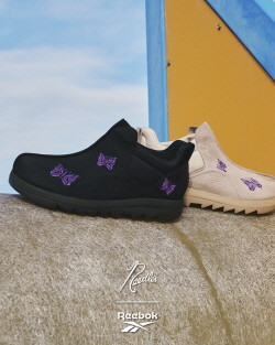 이번 협업 제품은 비트닉 시리즈 중에서도 슬립온 형태의 '비트닉 목 (Beatnik Moc)' 스타일을 모체로 활용했다. 부드럽고 내구성이 뛰어난 스웨이드 소재를 사용하고, 어퍼에는 섬세한 스티치 장식을 더해 세련된 느낌과 계절감을 살렸다. 신발의 측면에는 니들스를 상징하는 보라색 나비 모양의 심볼인 '파필리언 버터플라이' 자수와 리복의 벡터 로고를 적용해 두 브랜드의 인상적인 만남을 함축적으로 드러냈다.