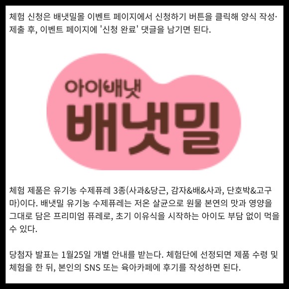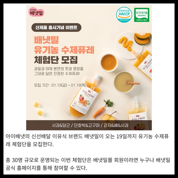 [카드] 배냇밀, 유기농 수제퓨레 체험단 모집