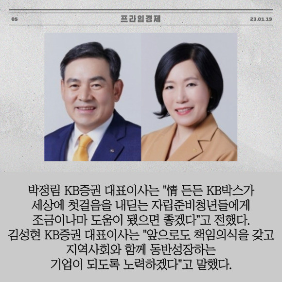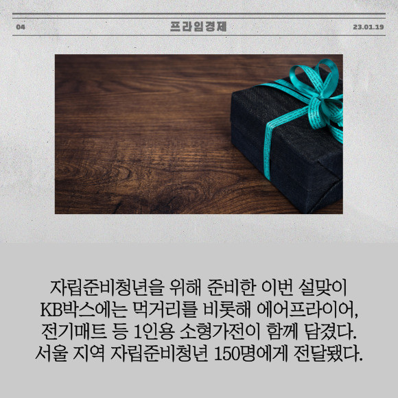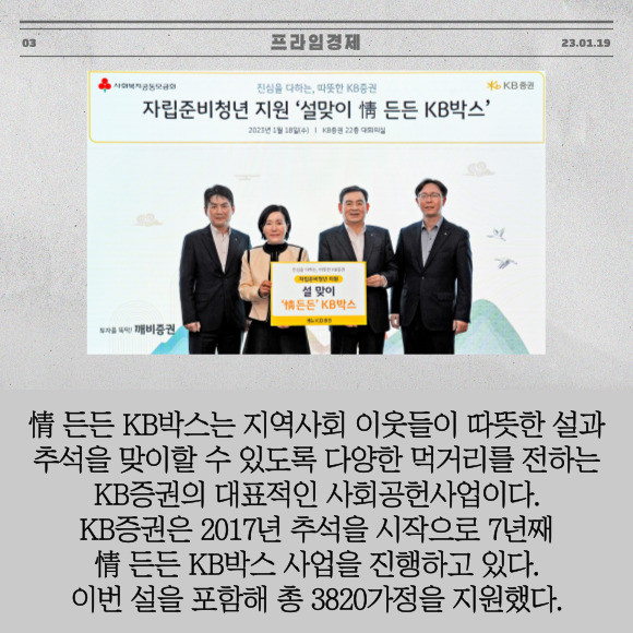 [프라임경제] KB증권은 설을 맞이해 자립준비청년들의 자립을 지원하기 위해 생활용품과 간편식을 담은 '情(정) 든든 KB박스'를 전달했다고 19일 밝혔다.