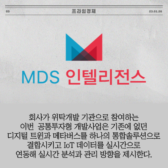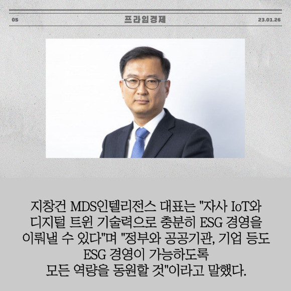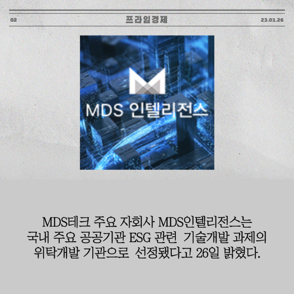 [프라임경제] MDS테크(086960) 주요 자회사 MDS인텔리전스는 국내 주요 공공기관 ESG(환경·사회·지배구조) 관련 기술개발 과제의 위탁개발 기관으로 선정됐다고 26일 밝혔다.
