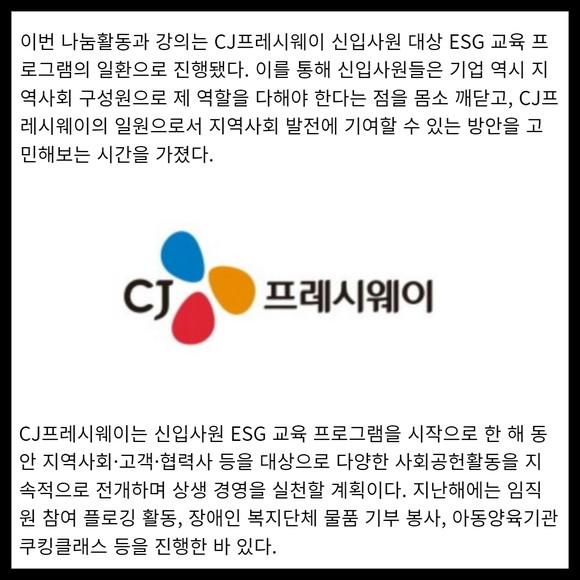 [카드] CJ프레시웨이, 신입사원 ESG 교육 진행