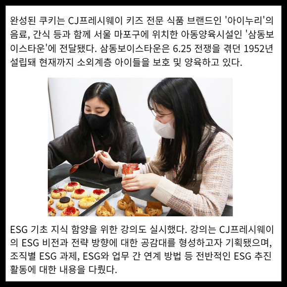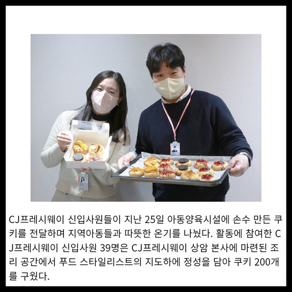 [프라임경제] CJ프레시웨이 신입사원들이 지난 25일 아동양육시설에 손수 만든 쿠키를 전달하며 지역아동들과 따뜻한 온기를 나눴다. 활동에 참여한 CJ프레시웨이 신입사원 39명은 CJ프레시웨이 상암 본사에 마련된 조리 공간에서 푸드 스타일리스트의 지도하에 정성을 담아 쿠키 200개를 구웠다.