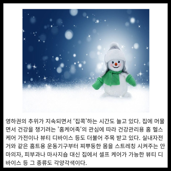 [프라임경제] 영하권의 추위가 지속되면서 '집콕'하는 시간도 늘고 있다. 집에 머물면서 건강을 챙기려는 '홈케어족'의 관심에 따라 건강관리용 홈 헬스케어 가전이나 뷰티 디바이스 등도 더불어 주목 받고 있다. 실내자전거와 같은 홈트용 운동기구부터 찌뿌둥한 몸을 스트레칭 시켜주는 안마의자, 피부과나 마사지숍 대신 집에서 셀프 케어가 가능한 뷰티 디바이스 등 그 종류도 각양각색이다.