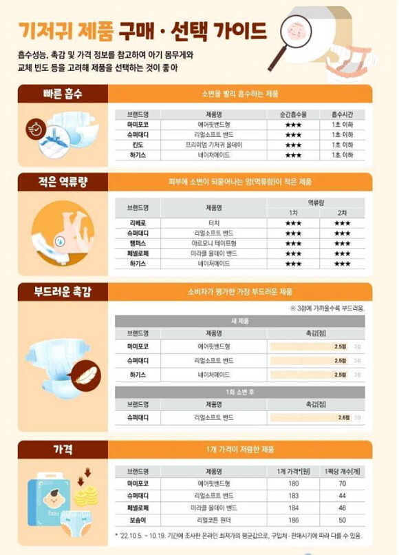 기저귀의 온라인 최저 가격은 '마미포코(에어핏밴드형)'가 개당 180원으로 가장 저렴했으며 '킨도(프리미엄 기저귀 올데이)'는 366원으로 가장 비싸 제품 간 최대 두 배 이상의 가격 차이가 있었다.