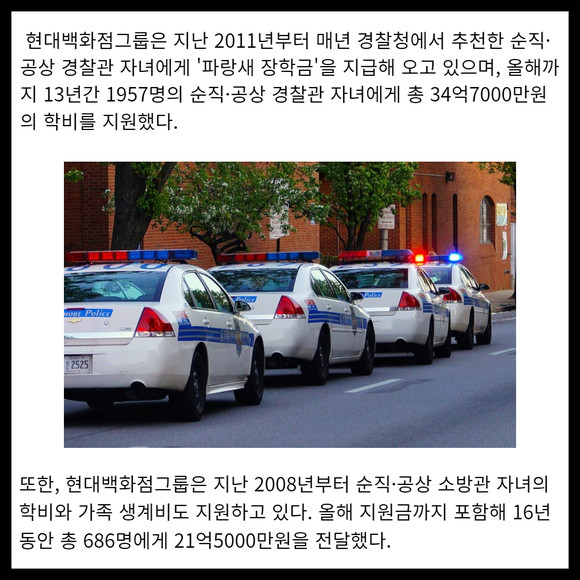 [프라임경제] 현대백화점그룹은 공무 수행 중 순직한 경찰관 자녀 157명과 상해를 입은 공상(公傷) 경찰관 자녀 186명 등 총 343명에게 장학금 5억원을 전달했다고 31일 밝혔다.