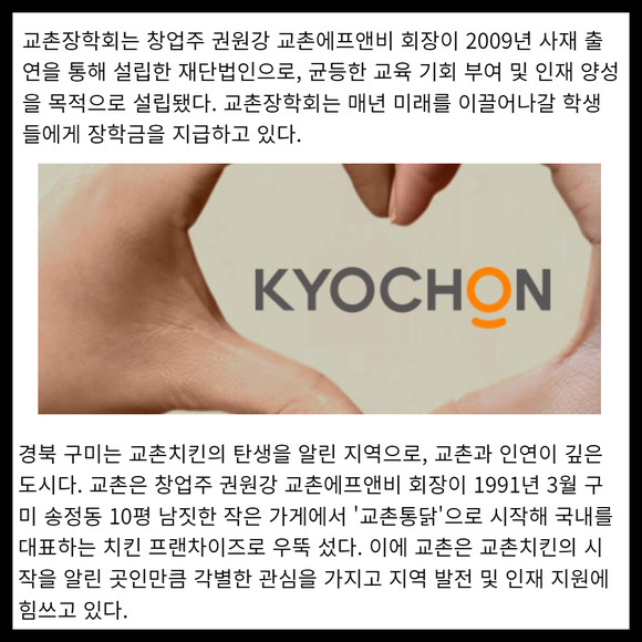 [카드] 교촌치킨, 구미 지역 대학교·고등학교에 3000만원 장학금 전달