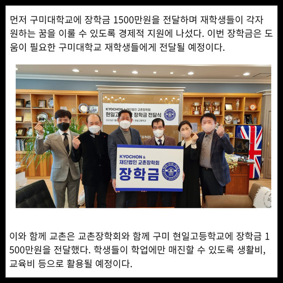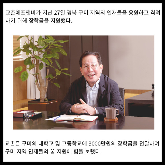 [프라임경제] 교촌에프앤비가 지난 27일 경북 구미 지역의 인재들을 응원하고 격려하기 위해 장학금을 지원했다.