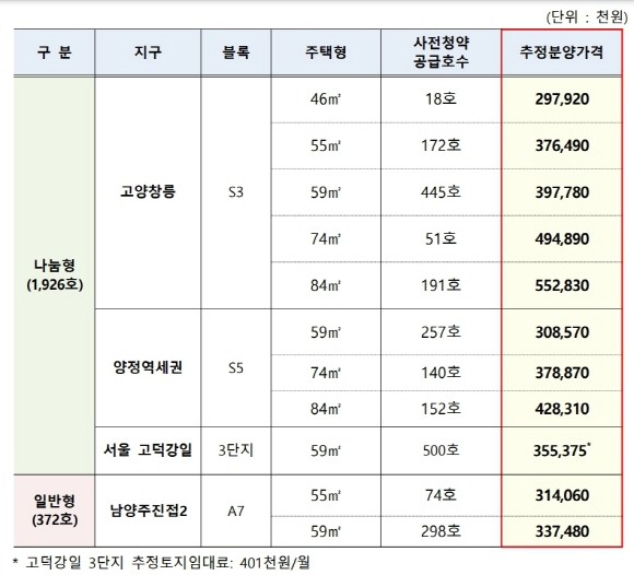 우선 한국토지주택공사(이하 LH)가 공급하는 주택은 나눔형 △고양창릉 877호 △양정역세권 549호, 일반형 △남양주진접2 372호이다. 추정분양가는 △고양 창릉 59㎡(172가구) 3억9778만원·84㎡(191가구) 5억5283만원 △양정역세권 59㎡(257가구) 3억857만원·84㎡(152가구) 4억2831만원 △남양주진접2(59㎡) 3억3748만원 수준이다.