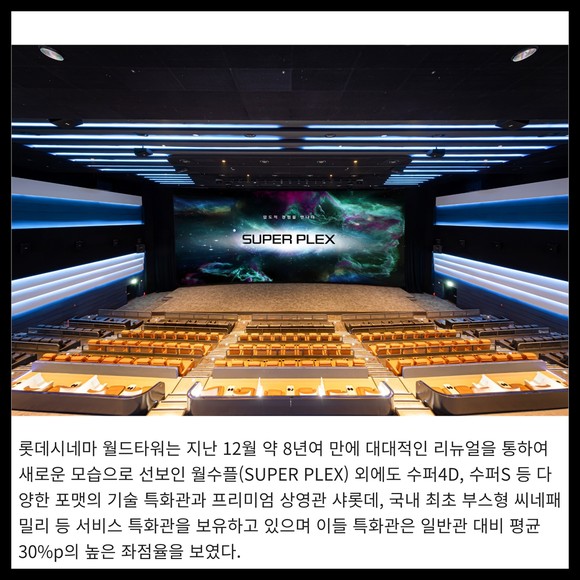 [프라임경제] 롯데시네마의 대표 PLF(Premium Large Format) 상영관 '월드타워 수퍼플렉스(이하 월수플)'가 <아바타: 물의 길> 흥행에 힘입어 관람객 5만 명을 돌파했다고 밝혔다.