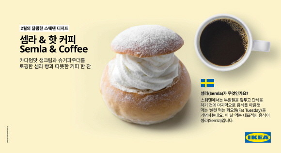 이케아 코리아는 셈라 출시와 함께 2월1일부터 28일까지 세트 메뉴 할인 행사를 진행한다. 이케아 패밀리 회원을 대상으로 평일 오후 2시부터 5시까지 셈라와 따뜻한 커피 세트를 특별가로 제공한다.
