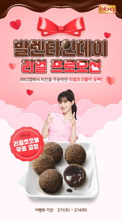 제너시스BBQ가 밸런타인데이를 맞아 BBQ앱에서 오는 11일에서 14일까지 인기 사이드메뉴 '리얼초코볼(5ea)'을 증정하는 프로모션을 진행한다.